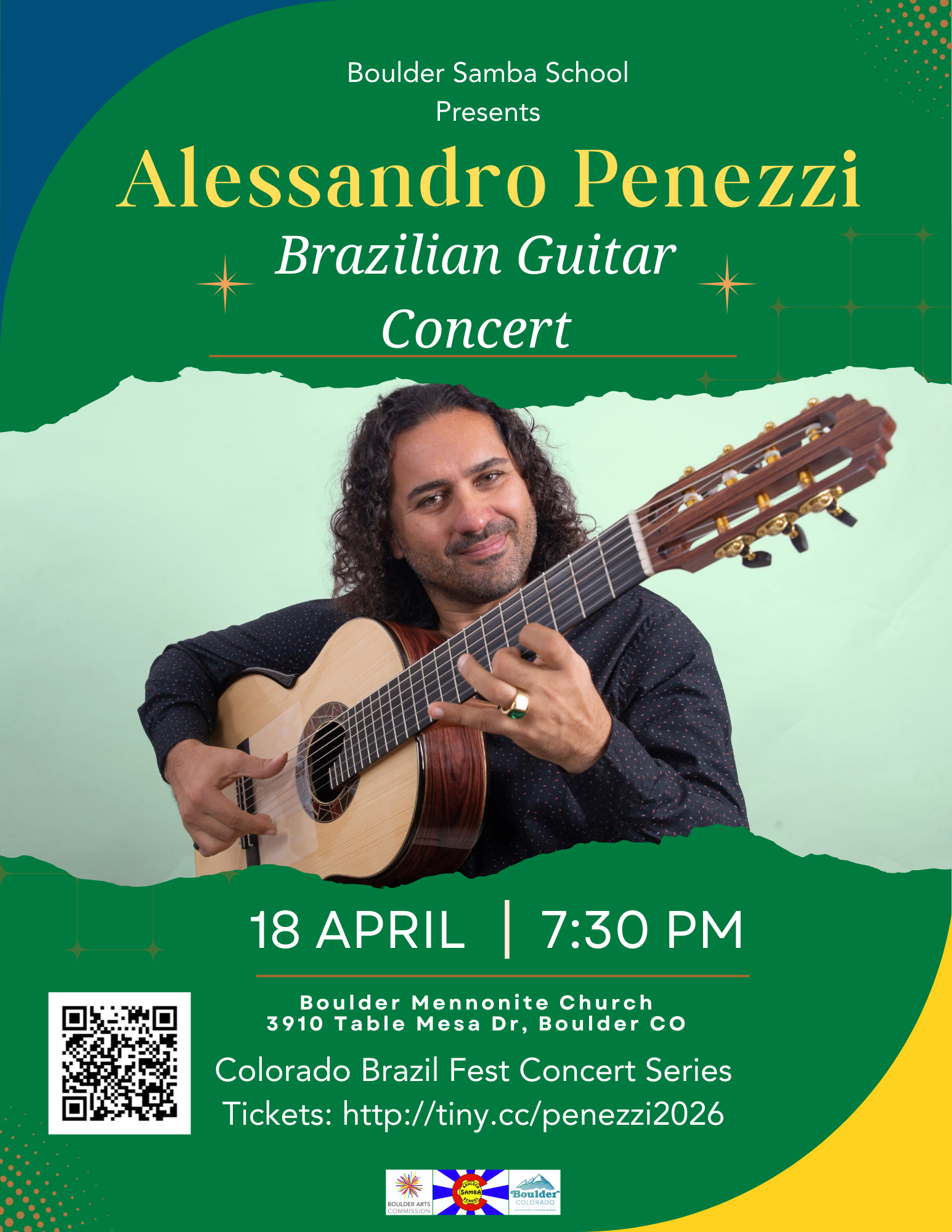 Alessandro Penezzi, one of Brazil’s most celebrated and award-winning 7- guitarists, returns to Colorado with a dazzling solo performance on April 18th. Drawing on the exuberant traditions of choro and other high-energy instrumental Brazilian styles, Penezzi delivers virtuosic playing marked by rhythmic precision, lyricism, and infectious joy.